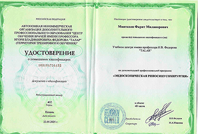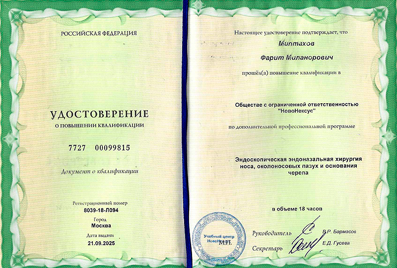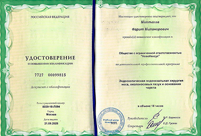В 2018 году прошел повышение квалификации в Северо-Западном государственном медицинском университете имени И.И. Мечникова по программе «Оториноларингология».