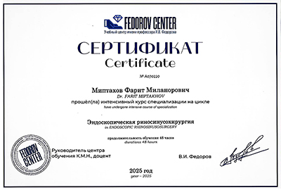 В 2019 году прошел повышение квалификации в Северо-Западном государственном медицинском университете имени И.И. Мечникова по программе «Актуальные вопросы воспалительных заболеваний уха».